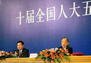 Chinese Foreign Minister Li Zhaoxing (R) addresses the media during a press conference held by the Fifth Session of the Tenth National People's Congress (NPC) at the Great Hall of the People in Beijing, capital of China, March 6, 2007.(Xinhua/Fan Rujun)
