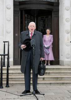 Northern Ireland's First Minister Ian Paisley speaks to the media as his wife Eileen looks on outside Stormont Parliament Building in Belfast, Northern Ireland, Tuesday, May 8, 2007. The unopposed election of Democratic Unionist Party chief Paisley and Irish Republican Army veteran Martin McGuinness to lead a new 12-member administration heralded an astonishing new era for Northern Ireland following decades of bloodshed and political stalemate that left 3,700 dead. (Xinhua/AFP Photo)