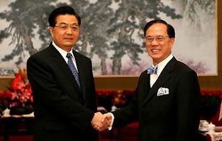 Chinese President Hu Jintao (L) shakes hands with newly re-appointed Chief Executive Donald Tsang of the Hong Kong Special Administrative Region (SAR) during their meeting in Beijing April 9, 2007. (Xinhua/Ju Peng)