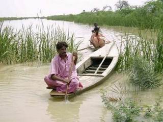 Villagers paddle boats over the flood water in Jhal Magsi Balochistan, some 480kms (298 miles) from Karachi, after a tropical storm hit coastal areas of Sindh and Balochistan June 28, 2007. REUTERS/Stringer (PAKISTAN)