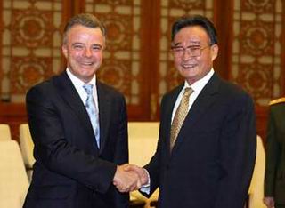 Wu Bangguo (R), chairman of the Standing Committee of the Chinese National People's Congress (NPC), shakes hands with visiting Australian Defense Minister Brendan Nelson during their meeting at the Great Hall of the People in Beijing, China, on July 9, 2007. (Xinhua/Ju Peng)