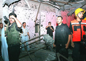 Palestinian gunmen and firefighters stand in front of a damaged money exchange shop after it was hit in an Israeli missile strike in Gaza City early yesterday.
