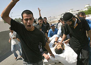 The body of Hamas member Khaled al-Farra is carried to the Khan Yunis hopsital in the southern Gaza Strip following clashes with Israeli troops.(File photo)