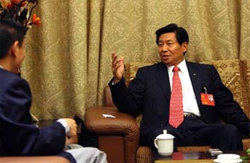 | Delegate Wei Jiafu, president of the China Ocean Shipping (Group) Company talks to a Reuters reporter in Beijing on Oct. 18, 2007. (Xinhua Photo) |