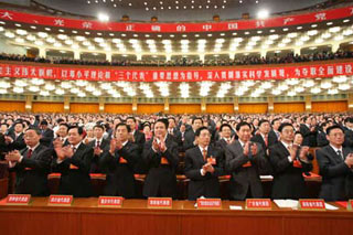 Hu Jintao said, " The meeting is now open. Today we have four items on the agenda. Firstly, to elect the members and alternate members of the 17th Central Committee, and the members of a new Central Commission for Discipline Inspection. Secondly, to approve the draft resolution on the report of the 16th National Congress. Thirdly, to approve the draft resolution on the work report of the Central Commission for Discipline Inspection. And fourthly, to approve the draft resolution on the amendment to the Constitution of the CPC. More than half of delegates who should take part in the today's meeting are present, satisfying the rules of the Congress. Now let's begin the first item on the agenda: to elect members and alternate members of the 17th Party Central Committee, and members of a new Central Commission for Discipline Inspection. "