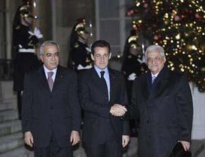 Palestinian President Mahmoud Abbas (R) and Palestinian Prime Minister Salam Fayyad are welcomed by France's President Nicolas Sarkozy (C) as they arrive at the Elysee Palace in Paris December 16, 2007. REUTERS/Philippe Wojazer