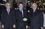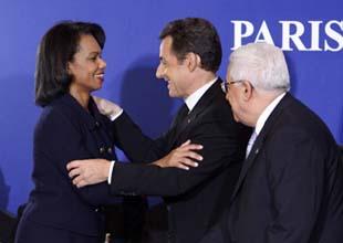 French President Nicolas Sarkozy (C) welcomes U.S. Secretary of State Condoleezza Rice (L) as Palestinian President Mahmoud Abbas looks on at the start of the international donors conference in Paris Dec. 17, 2007.(Xinhua/Reuters Photo)