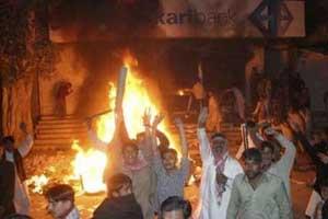 Supporters of former Pakistan prime minister Benazir Bhutto protest against her assassination after setting a bank on fire in her home town of Larkana, December 27, 2007. (Xinhua/Reuters Photo)