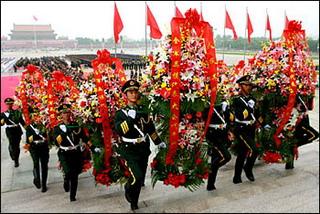 Model soldiers present wreaths in remembrance of martyrs to the Monument to the People's Heroes in Tiananmen Square July 31, a day before the 80th anniversary of the founding of the People's Liberation Army (PLA).