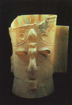 展品简介:杯子上用高浮雕手法表现的是太阳神的面孔,戴着一顶喙很突出的飞禽形头饰,耸出器表的眼睑和鼻子使他多了一分狞厉的色彩。雕琢杯子所用的雪花石膏乳白色微透明,是前殖民时代的贸易中非常贵重的商品。值得注意的是玛雅贸易中这类奢侈品的交易占了相当大的比例,可以说明当时的商业在很大程度上是为礼仪活动的需要服务的,这也使得美索亚美利加的广阔区域内人们的宗教信仰趋于一致。