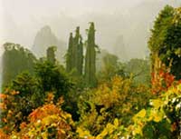 御笔峰座落于天子山自然保护区,归类于石家檐游览线。山谷中数十座错落有致的秀峰突起,遥冲蓝天,靠右的石峰像倒插的御笔, 靠左的石峰似搁笔的“江山”。此景变化万千,日照霞染生辉,云雾涌动时隐时现,春月透过花丛,五层峰峦相迭。