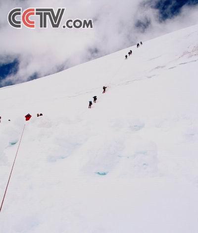 10月3日早晨10点,中央峰A组队员向C2进发。出C1不久就是一处近80度的冰雪陡坡。