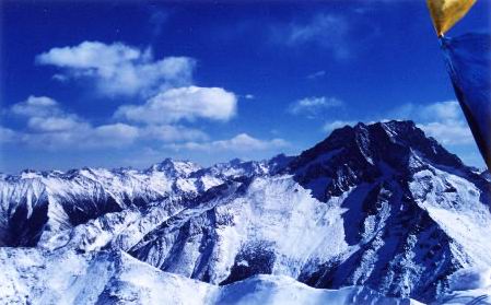 接近两点,第一队的队员们三步一喘十步一歇地到达垭口。这时风很大,又干燥,刮起的雪打到脸上就像小石粒打在脸上一样。协作在垭口上往前走了一段后,就开始向空中撒龙达,并且嘴里还念着大家听不懂的经文,一次膜拜山神,祈祷平安。
