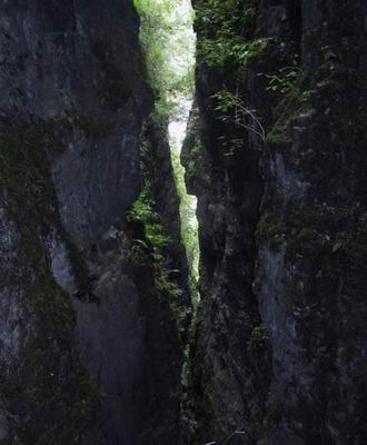 翡翠谷里有个一线天,遮天蔽日,清冷阴凉。远观很窄但走到近前也有2米宽,只是自上而下落差有百米多,确实险要。