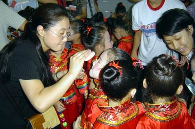 颁奖晚会表演前,老师和孩子忙着化妆,连水房也跟着一起沸腾了。(图文/兰华)