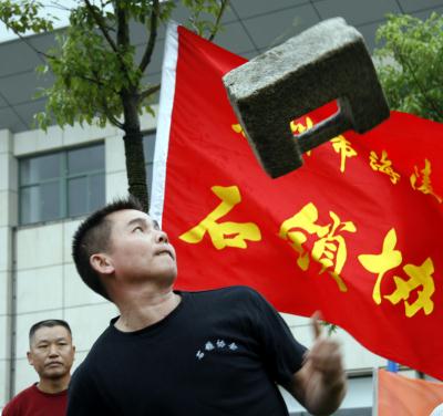 2007年6月2日,一位体育健身爱好者表演抛石锁。当日,第二届江苏“沿江体育带”全民健身大联动在泰州市启动。来自南京、苏州、扬州等江苏沿江八市的近千名体育爱好者参加了各项特色体育健身活动。 新华社发(许慧 摄)