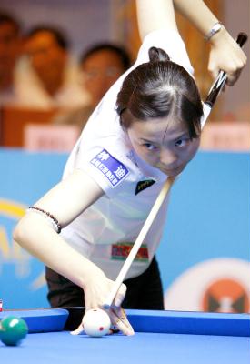 6月25日,北京选手李佳在比赛中。当日,在首届中国职业九球排名赛(上海站)女子组决赛中,北京选手李佳以9比8战胜北京选手韩雨,夺得冠军。 新华社记者凡军摄