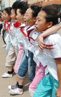 2007年6月26日,延吉市中央小学五年级的学生在练习多人绑腿跑。目前,吉林省延边朝鲜族自治州首府延吉市的部分小学将一些团体项目引入学校学生阳光体育运动之中,锻炼孩子们的协作和拼搏的团队意识,让他们充分感受集体的力量。 新华社记者徐家军摄