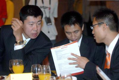 2007年9月13日,中国男篮球员王治郅(左)出席慈善拍卖晚宴。当晚,2007姚明纳什慈善拍卖晚宴在北京钓鱼台国宾馆举行。此次晚宴拍卖筹得的善款连同14日慈善义赛的门票收入,都将捐助给中国的贫困儿童。 新华社记者罗晓光摄