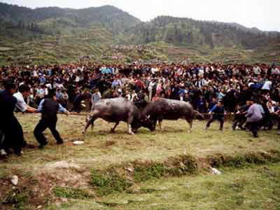 中国水族进入端节年庆 央视国际 2004年11月08日 14:23 进入11月,水族端节开始,水族群众一年一度的丰收庆祝和祭祖活动在聚居贵州的水族各地展开。记者来到黔南采访,亲眼目睹了水族群众喜悦的过年场面。 端节又叫“瓜节”,水语称“借瓜”或“借端”,是水族传统历法中新年的开始,相当于汉族的春节。水族悠久的历史文化中,最为隆重的民间节庆就是端节。端节要从每年农历8月持续到10月,在不同村寨四地举行。水族端节从头至尾时间长49天,是世界上延时最长的节日。 贵州三都是全国唯一的水族自治县,全国40多万水族人民,有20万世居于此,其他的多也分布于三都临县的地方。 记者11月2日在三都水族自治县看到,节日里的水族群众,载歌载舞,相聚狂欢,场面壮观。客人在这里,不仅可以看到古老神秘的水书、巧夺天工的马尾绣展以及舞火龙、耍水龙、抢鸭子、赛马等传统水族民间表演,还可以参观水族同胞祭祖的庄重场面。