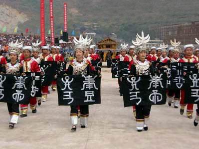 水书方队 11月2日晚,记者来到水族居民占99.6%的三都县三洞乡水根村。这里因为20年前一场大火,把原来的木结构干栏建筑全部烧光,200多户人家的房屋全部是石墙瓦房,家家门上都贴了用神秘水书文字写的红对联,放眼看去的田野间,尽是威武伫立的收割后的稻草垛子。在一阵一阵的铜鼓、皮鼓声里,一浪一浪的客人正从八方赶来。 (记者陈屹) |