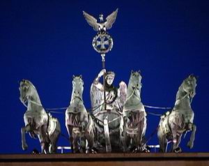 1989年12月31日,两德重新统一前夕,勃兰登堡门重新开放。1992年,经过彻底维修后的铜车马及女神像又重新安放在勃兰登堡门上。