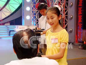 在“主持人类”的比赛中,来自新疆的选手李柏洋把采访进行到评委们的头上。