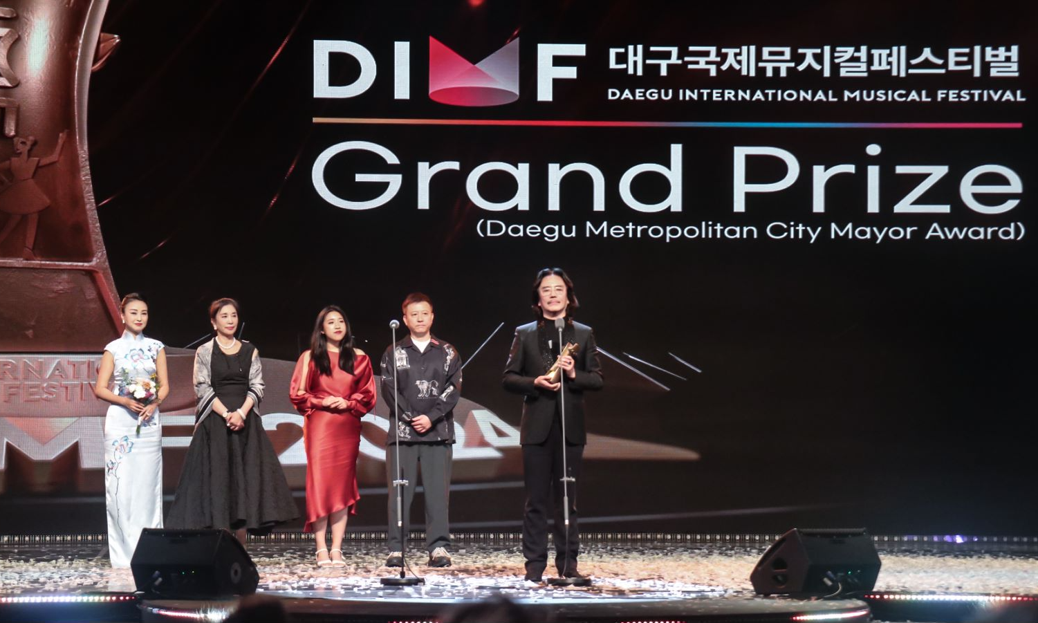 近日,第18届韩国大邱国际音乐剧节奖项揭晓,2024年国家艺术基金资助项目——音乐剧《飞天》,荣获了第18届韩国大邱国际音乐剧节最高奖——“Grand Price大奖”,中国东方演艺集团青年演员、《飞天》“赶路人”饰演者高天鹤荣获了最佳男主角奖。当晚,《飞天》还荣获了“ 外国音乐剧奖”“评委奖”等多项提名,“守护人”饰演者李泽美荣获了最佳女主角奖提名、“乾达婆”饰演者杨璐荣获了最佳女配奖提名。