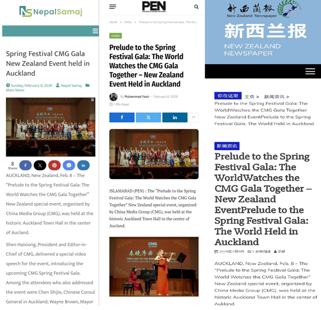 截至目前,新西兰33频道、新西兰天维网、《新西兰报》《新西兰中文先驱报》、新西兰华人头条、泰国Daily News传媒、巴基斯坦《每日团结报》、巴基斯坦经济人网、尼泊尔社会网等亚太地区多家主流媒体对“春晚序曲 全球看春晚”新西兰专场活动进行了报道。