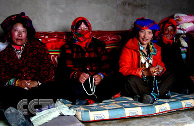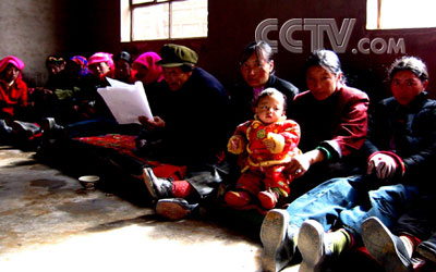晚上,吃过香喷喷的水煮肉,喝过酽酽的酥油茶,在白达家刚盖好不久的新房中,31位妇女沿墙而坐,有4户人家由于各种原因未来参加,有的人家则来了不只一人,并且大部分女人带着孩子来开会,因为,“孩子放在家里没人带”。会场里充满着女人低声聊天不时发出的笑声、孩子哇哇的哭闹,而书记才三朗读《中华人民共和国计划生育法》的声音,就从这些吵吵闹闹的背景声中顽强地露出来。他坚持着将整部《计划生育法》读了一遍,然后和队长白达一起说起本队的妇女工作,主要是今后娶媳妇要找有户口的人,没有户口的人不要找,否则后果自己负。再有重申本乡对于计划生育的政策:生一个奖励,生两个鼓励,生三个罚款。开会的妇女们似乎已经习惯这些内容了,她们三五个凑一起小声说着话,意识到声音太大时就停一小会儿再接着说,或者忙着给襁褓中的婴儿喂奶,或者耐心哄着瞌睡的孩子,或者自己干脆盹着了。下午和大家说说笑笑的才三书记和白达队长此时一脸严肃,坐在一群“千姿百态”的女人们中间,场面颇有些搞笑。