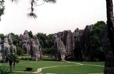 小石林确实要小得多,就像一个精致的盆景。 一块块草坪象绿融融的地毯,碎石铺的小径蜿蜒,一棵大大的榕树开着金灿灿的花,地上有纷纷落英。可是不知道为什么,小石林不让进去,我们冒然闯入却被管理人员叫了出来,那么精致的美景却“只可远观,不可亵玩”了。