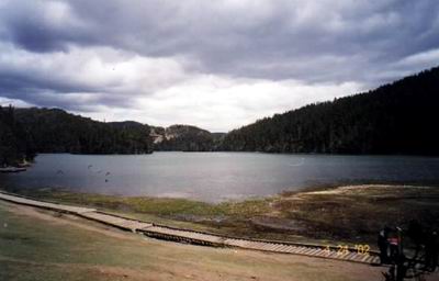 碧塔海,深远、宁静,原木铺成的小径直通到水边 |