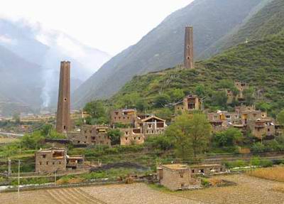 出城沿峡谷中蜿蜒的公路前行,不时能看见公路边及河对岸的藏族村寨。嘉绒藏族的住房与草原牧区的账房和松潘、南坪一带的木板房相比,另具特色。建筑多在背风向阳、土质坚实且方便生产和生活的地方,大多依地势择险而居。用泥土片石砌筑而成,方正高耸,片石堆砌讲究,层层叠压,房屋四角上翘,立面呈上小下大的梯形,一般三至四层。顶层半封闭式向阳敞开,设有经堂与客房,造型美观,冬暖夏凉,门窗装饰艳丽美观。