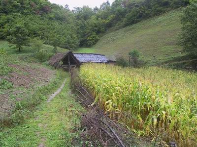 原来旁边有一户人家在小路的尽头,木屋前的玉米地黄澄澄的玉米散发着诱人的清香。