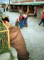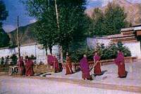 从玛曲乘车到藏族村寨郎木寺。一路净是草原风光。运气好的话,路途中还可以看到黑颈鹤。快到郎木寺一山坡上最好让车停一下,这里是远眺郎木寺全景的最好地方。 “郎木”在藏语中有仙女的意思,传说曾有仙女化为山上的岩石而得名。这里是一个和善的小山庄,风景如画。小溪两侧各有一座喇嘛庙,分属甘肃、四川两省。两寺中间是一座小清真寺。藏回两族在这里和平相处。 在这里有三条游玩路线很有吸引力: 1、骑马攀登附近海拔4000余米的主峰--华盖峰,山顶有一块小平原,上有玛尼堆和藏族人的插箭,是藏区有名的吉祥山峰之一; 2、骑马或乘车到20千米外的露天温泉洗澡,即便冬天水温也异常舒服; 3、骑马进入峡谷探索真正藏族村落,山谷中有藏族古建筑。